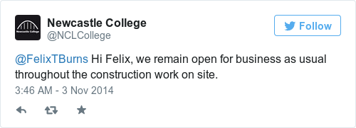 The former student even sent a tweet to Newcastle College on the morning of 3 November, making sure the school would be open that day, because there was construction in progress at the time.