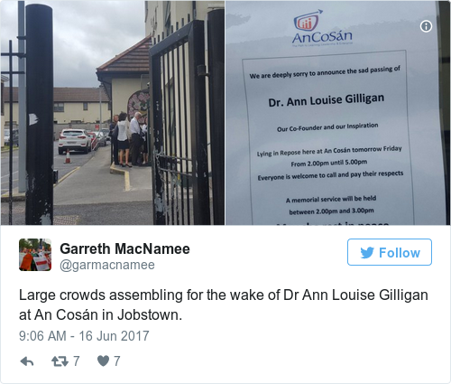 She added: “As co-founder and director of An Cosán a centre of learning, leadership and enterprise in Jobstown, Tallaght West Ann Louise demonstrated her commitment and love for the people of Tallaght and the wider communities. Her vision was that education transformed poverty and she believed in the power of imagination to bring about personal and social change.”