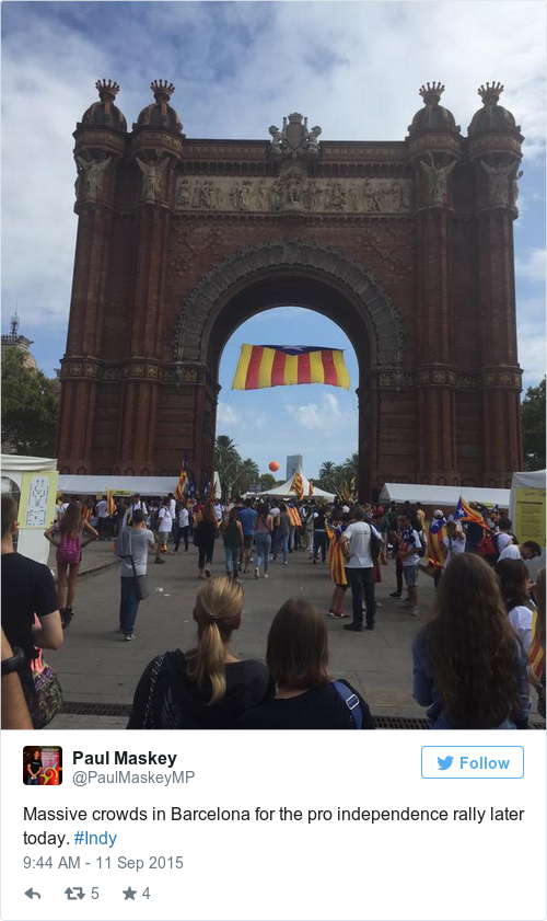 This video, posted this evening by the Assemblea Nacional Catalana (Catalan National Assembly) shows the astonishing scale of today’s demonstration.