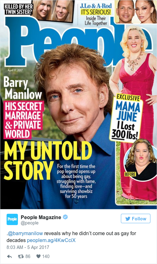 POP LEGEND BARRY Manilow has told People magazine that he hid being gay for decades because he thought he would be “disappointing fans if they knew.”