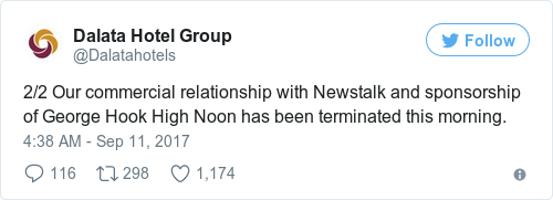 “Our commercial relationship with Newstalk and sponsorship of George Hook High Noon has been terminated this morning.”