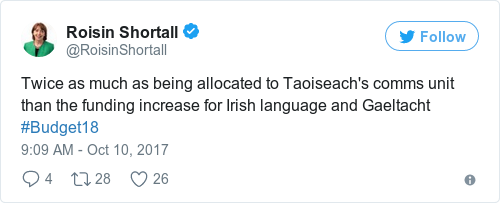 But some opposition politicians have said that it’s not good enough. The Social Democrats leader Roisín Shortall compared the amount being spent on the Taoiseach’s new Strategic Communications Unit (€5 million) to the increase in funding for groups geared towards promoting the Irish language (€2.5 million).