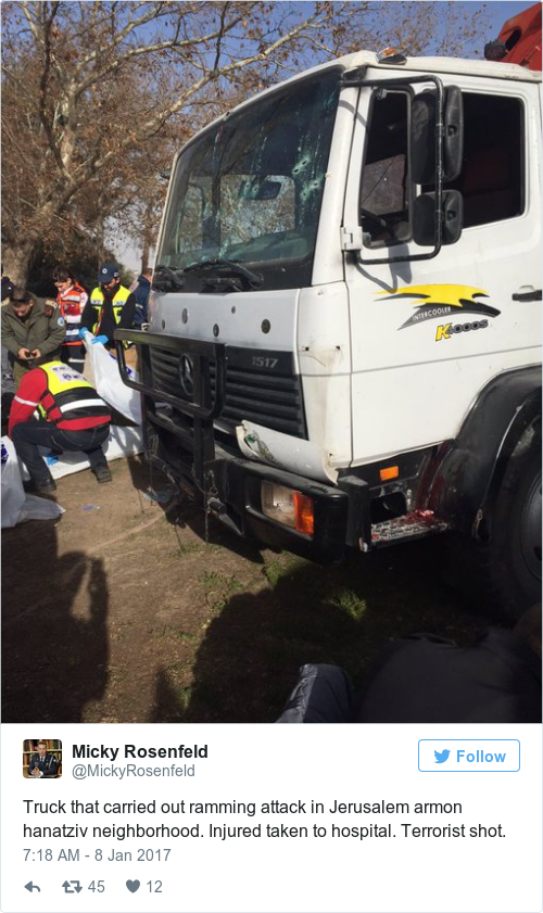 Police spokeswoman Luba Samri says the truck veered off course and struck a group of soldiers who had just disembarked from a bus. She says the attacker has “been neutralised”.