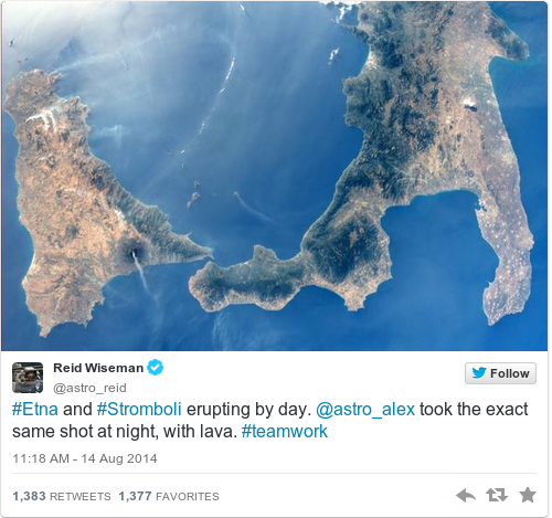A photo taken earlier today by astronaut Reid Wiseman from the International Space Station shows Etna erupting with along with Mount Stromboli, a volcanic island north of Sciliy which is also spewing ash into the air above the Tyrrhenian Sea.