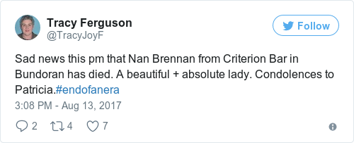 NAN BRENNAN, ONE of two elderly sisters who ran the famous Brennan’s Criterion Bar in Bundoran, Co Donegal, has passed away.