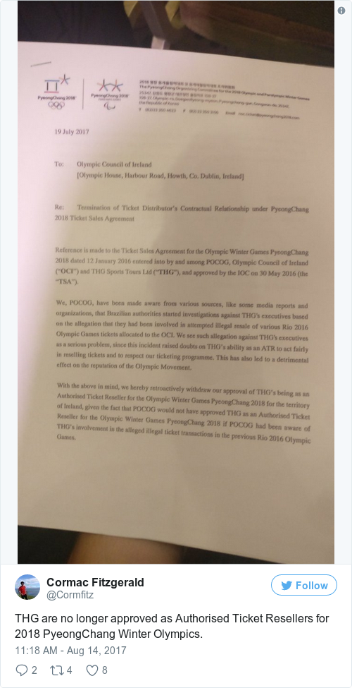 However, it was revealed today that the 2018 PyeongChang Winter Olympics organising committee has withdrawn approval for THG to act as Authorised Ticket Reseller (ATR) there.