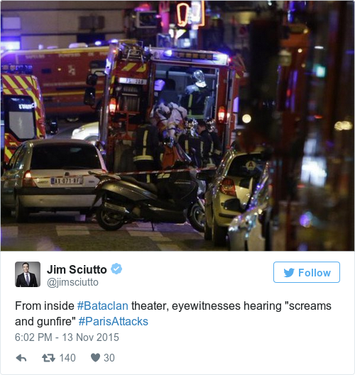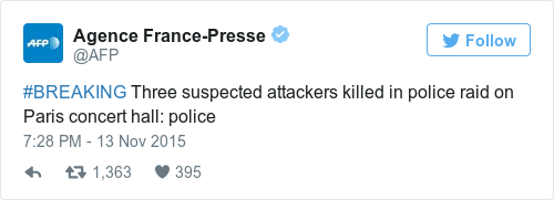 Meanwhile, Al Jazeera reports that more emergency services have arrived on the scene at the Bataclan theatre in the last few minutes, where some 100 people are being held hostage.