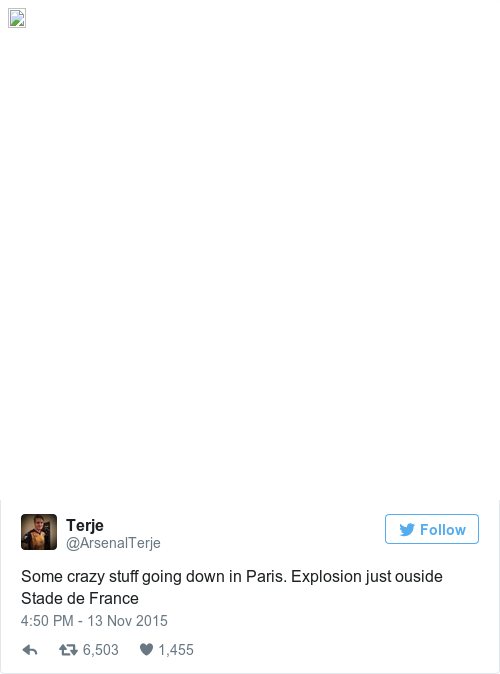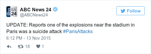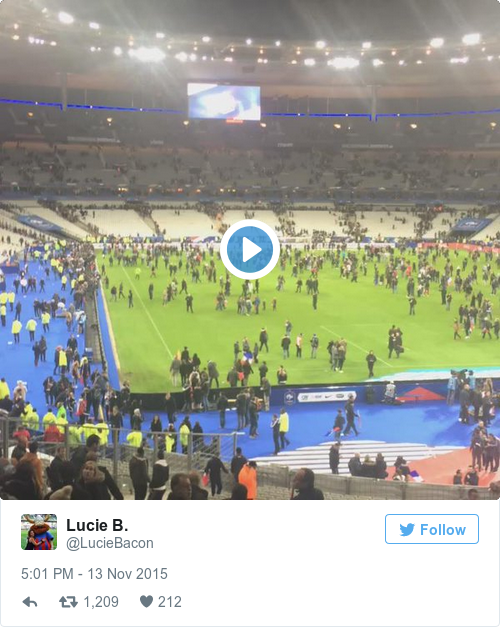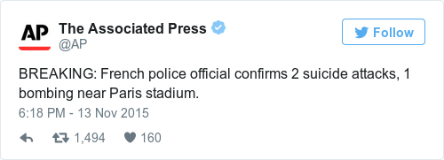 - Three explosions, including two suicide bombings, outside the Stade de France during France-Germany football match. President Francois Hollande evacuated.