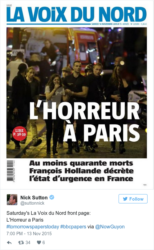La Voix du Nord leads with “Horror in Paris.”