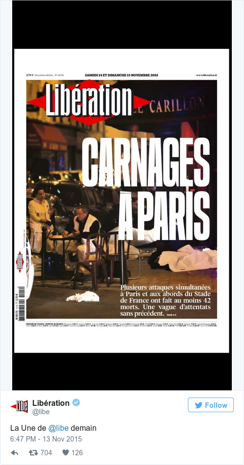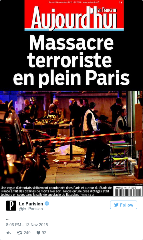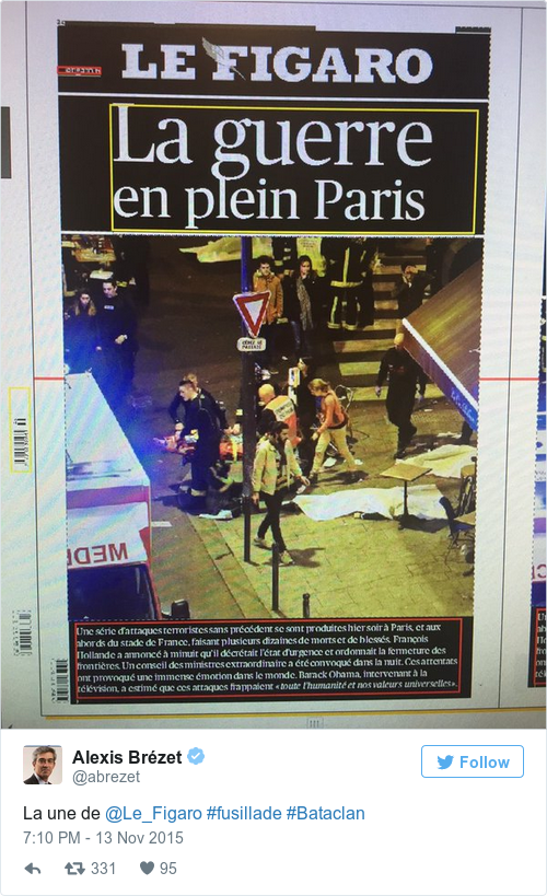 Le Figaro’s headline is “War right in the middle of Paris.”