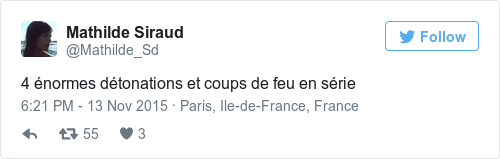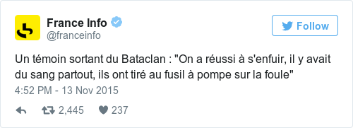 I am still at the Bataclan. First floor. Badly hurt. The attack was very quick. There are survivors inside. They slaughtered everyone, one by one…