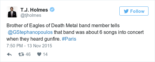 This Facebook post from Eagles of Death Metal saying they’re still trying to find out if all the members of the band and their crew are safe: