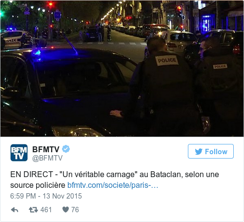 BFMTV reporting a police source as saying there is “real carnage” at the Bataclan theatre.