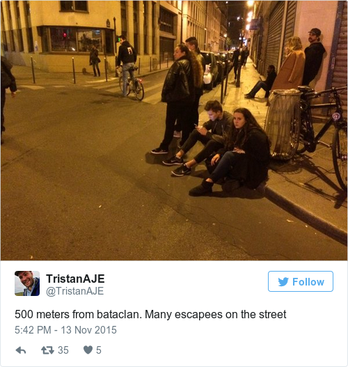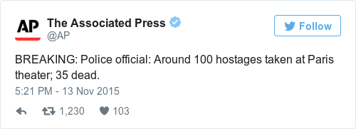 AP are reporting that 35 people have been confirmed dead, with 100 hostages taken at the Bataclan theatre on Boulevard Voltaire in Paris