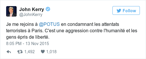 US Secretary of State John Kerry, who speaks fluent French, has addressed his condolences to the people of France, in their own language.