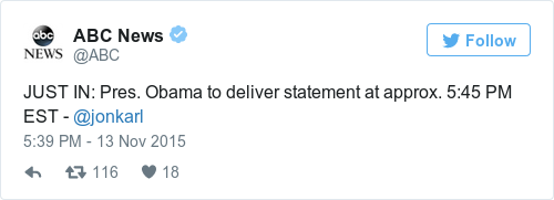 President Obama to deliver a statement regarding the Paris attacks at 10.45pm Irish time.