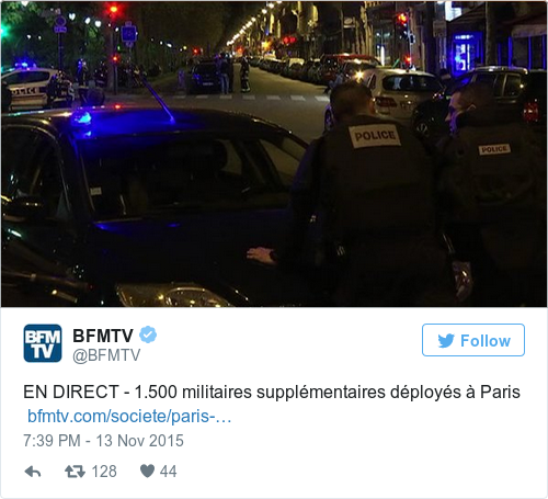 This video, from BFMTV, gives a sense of the extremely tense atmosphere on the streets of Paris tonight: