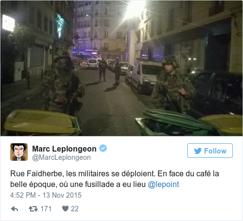 One witness at the scene of the shooting near McDonald’s at around 9.30 pm says they passed the corner of Rue de la Fontaine-au-Roi and Rue du Faubourg du Temple saw four or five motionless bodies, in a “sea of blood.”