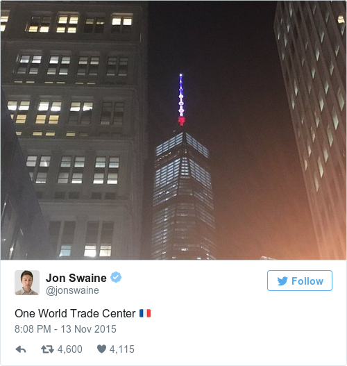 Guardian journalist Jon Swaine has captured this image of the French tricolour being shone from the top of One World Trade Centre in New York – the successor to the Twin Towers.