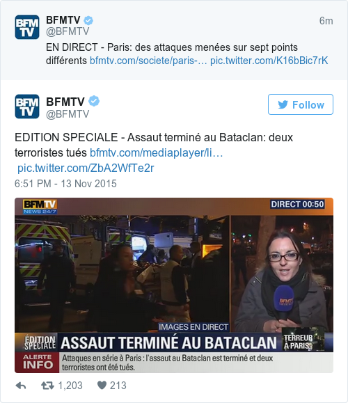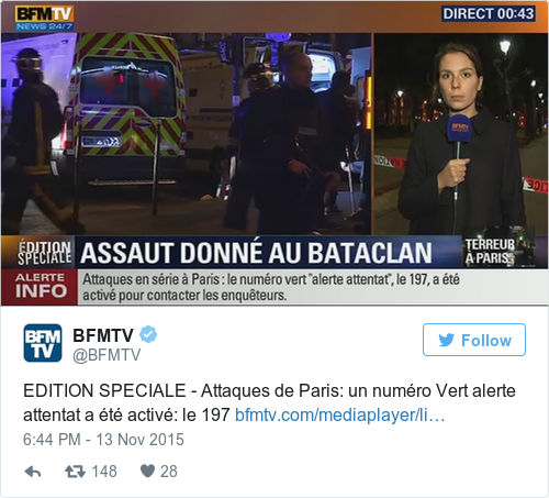French tv confirming a storming of the Bataclan theatre