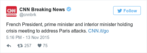 Obama: “We are reminded in this time of tragedy that the bonds of liberté, égalité and fraternité are not only values that the French people care so deeply about but they are values that we share. Those values are going to endure far beyond any act of terrorism or any hateful vision of those that perpetrated the crimes this evening.”