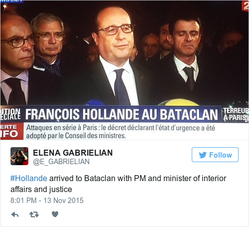 “France must be strong and great… We also have to call on everyone to be responsible. What the terrorists want is to make us afraid, to seize us with fear. There is something to be afraid of… But we are a nation that can immobilise and once again can overcome the terrorists”