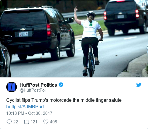 JULI BRISKMAN DIDN’T think twice when she gave US president Donald Trump the finger as his motorcade passed her while she was cycling on a road near his golf club.