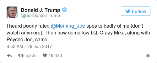 “I heard poorly rated @Morning_Joe speaks badly of me (don’t watch anymore),” wrote Trump, an avid cable news watcher.