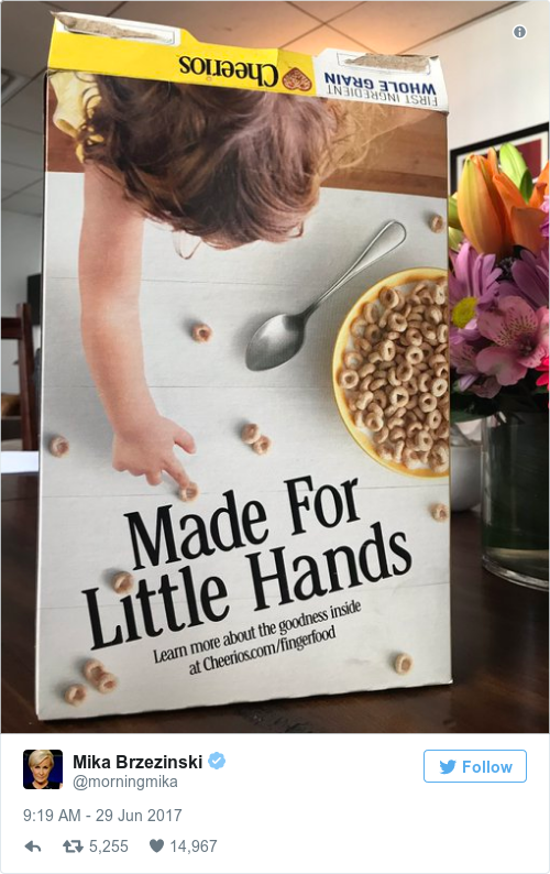 Brzezinski herself appeared uncowed by Trump’s onslaught. She responded with a post of her own, a photo of a young child reaching for Cheerios cereal.