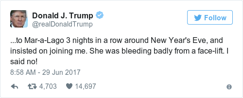 “Then how come low I.Q. Crazy Mika, along with Psycho Joe, came to Mar-a-Lago 3 nights in a row around New Year’s Eve, and insisted on joining me. She was bleeding badly from a face-lift. I said no!” Trump tweeted.