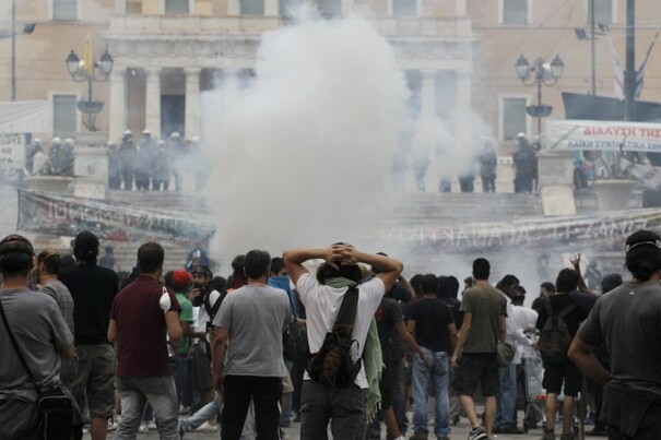 Riot police and protestors at Syntagma Square in Athens were separated by a cloud of tear gas on 29 June as protests against austerity measures hit a climax. Greece has since changed government and teetered on the edge of financial default. (AP Photo/Petros Giannakouris)
