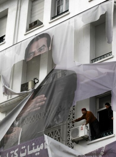 Two men try to remove a torn photo of Tunisian President Zine El Abidine Ben Ali in the centre of Tunis on 16 February as he finally flees to protests and flees the country. Tuniais gets its first multiparty government - and other Arab nations are inspirated to follow. (AP Photo/Christophe Ena)