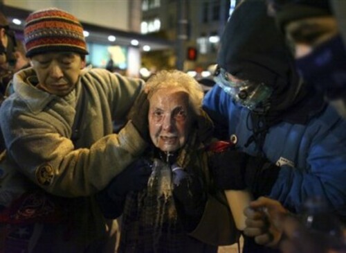 This photograph of 84-year-old Dorli Rainey, pepper-sprayed in the face at the Occupy Seattle anti-capitalist/banking protest struck a chord with similar protests around the world - but also with previously disinterested onlookers. (AP Photo/seattlepi.com/Joshua Trujilo)