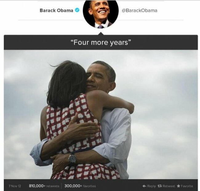 You won’t be surprised to read that this touching picture of US President Barack Obama hugging his wife Michelle that was tweeted with the words ‘Four more years’ on the night of his re-election on 6 November was retweeted the most.