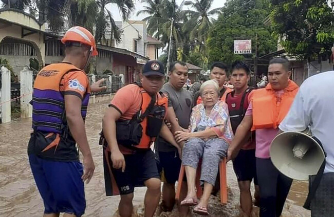 In this image provided by the Philippine Coast Guard, an elderly woman sits on a chair while being carried by coast guard personnel wading through floodwaters in Plaridel. AP/PA Images