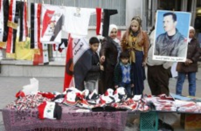 A Syrian family looks at hats, scarves and shirts with Syrian flags and Assad portraits in Damascus yesterday. AP Photo/Muzaffar Salman/PA Images