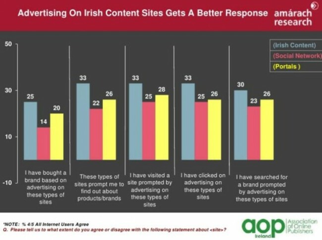 The report’s authors concluded that the more an audience trusts a content site and finds its content relevant to them and their interests, the more effective advertising will be on that site. Gerard O’Neill of Amárach Research said that the survey showed how Irish consumers are “differentiating between the sites that they use” and that “brand awareness and purchasing decisions is higher for Irish content sites versus other types of sites”.