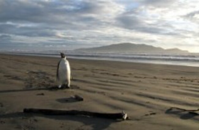 All alone... The penguin wandering along Peka Peka Beach in New Zealand on Monday. AP Photo/Richard Gill, Department of Conservation