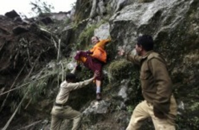 Members of Indian Army help a Buddhist monk to descend a huge landslide following Sunday's 6.9 magnitude earthquake in Sikkim, India. Altaf Qadri/AP/Press Association Images