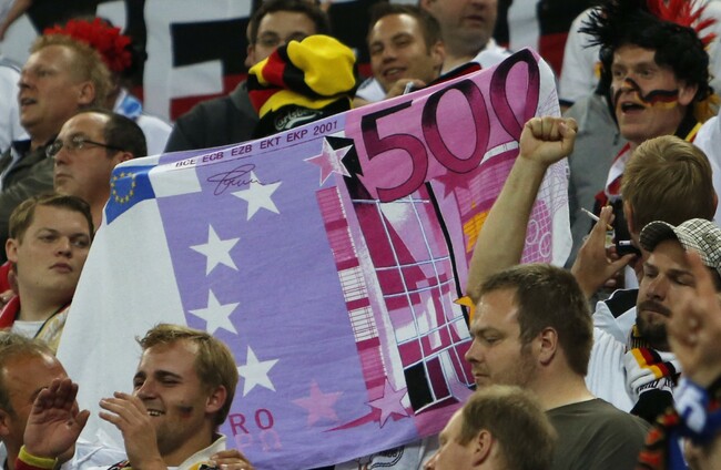 German fans display a fake €500 note during a Euro 2012 match with Greece. Thanassis Stavrakis