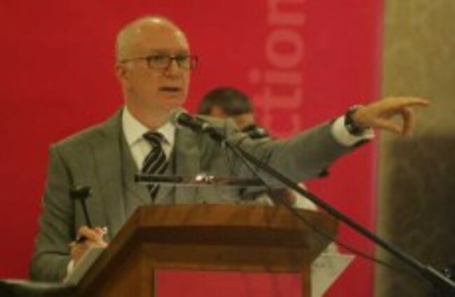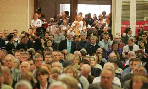 Auctioneer Garry Murphy conducting the auction in a packed Shelbourne Hotel. Eamonn Farrell/Photocall Ireland