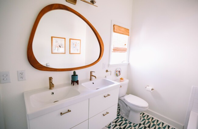 Sleek storage: With varying shades of green laid out in a loud chevron pattern, @hunkerhome does the right thing by adding a double mirror to break up the space. Storage behind the doors keep the space sleeker, too.