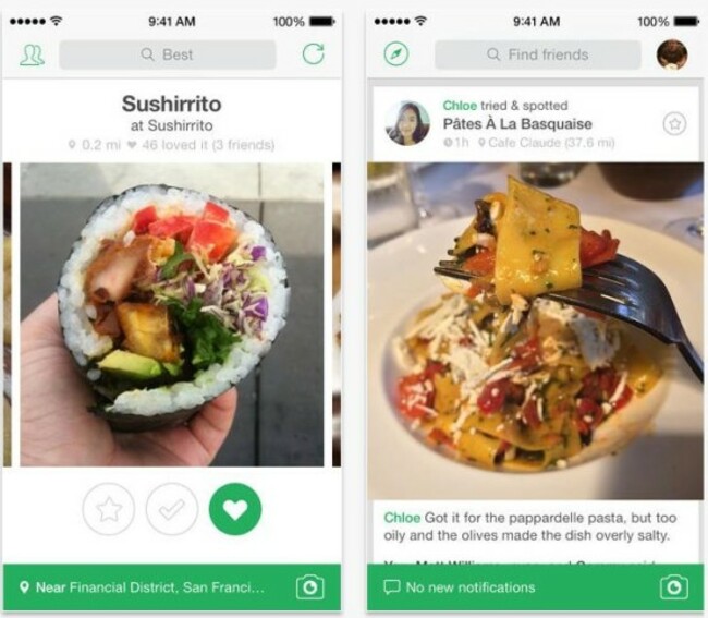 The app (for iPhone, Android and Windows) locates you and gives you suggestions based on where you are, or you can search for types of food you want, restaurant recommendations or can even make recommendations yourself. Give something back, like.