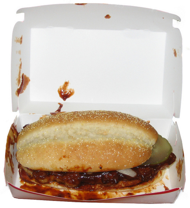 Doesn’t this look simply delicious? Ahem. The McDonalds McRib burger is a meat patty formed in the shape of ribs, and is made from “pork, water, salt, dextrose, preservatives (BHA, propyl gallate, citric acid)”. Yummy.