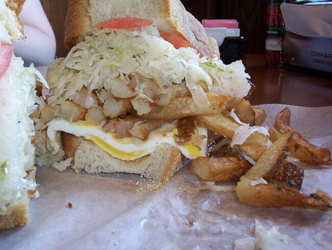 Chip sandwiches = great. Chip sandwiches with coleslaw AND egg? Some people’s version of culinary hell, we’d wager. Still, if it floats your boat you can pick one up in Primanti Bros in Pittsburgh.