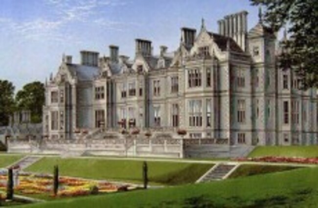 Dartrey, Rockcorry, Co. Monaghan was built in 1846 and designed by William Burn as a large Elizabethan Revivial mansion to replace an earlier house on the site. Built for Richard Dawson, third Lord Cremorne and later first Earl Dartry, it had very long facades with legions of mullioned windows, oriel windows, Tudor chimneys and curvilinear gables relieved by square turrets with cupolas. On the garden front (pictured) was a two level terrace facing onto Lough Dromore. On an island in the lake there was also a fine Mausoleum to the design of James Wyatt from around 1770 which is now roofless. The house was demolished in the 1950s. All that remains of the estate are various gatehouses, the ruined Mausoleum and a fine stable block built around five sides of an octagon. (Image: Archiseek.com)