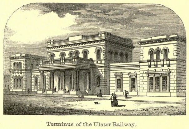 Great Victoria Street Railway Station, Belfast. The Ulster Railway opened Belfast’s first railway terminus in 1839. By 1852 the Dublin and Belfast Junction Railway was completed, making it the terminus for the most important main line in Ireland. The Ulster Railway had added a new station building in 1848 to designs by John Godwin, replacing the original station by Thomas J. Woodhouse. Sadly, in the early 1970s Northern Ireland Railways closed both Great Victoria Street and the Belfast Queen’s Quay terminus of the Bangor line and replaced them with a new Belfast Central station. The station buildings were demolished and the Europa Hotel and the Great Northern Tower built in its place. For many years, part of the railway shed remained, in use as a bus station, before being demolished. (Image: Archiseek.com)