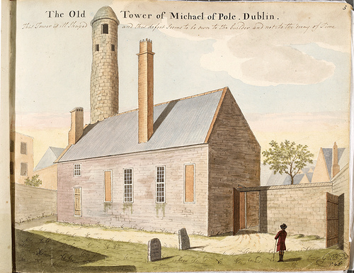 Here is St Michael le Pole, which was once located between Chancery Lane and Ship Street. 'St Michael of the Pool' overlooked the 'Black Pool' from which Dubhlinn took its name. The round tower stood for almost 700 years before it was removed. (Image: Archiseek.com)