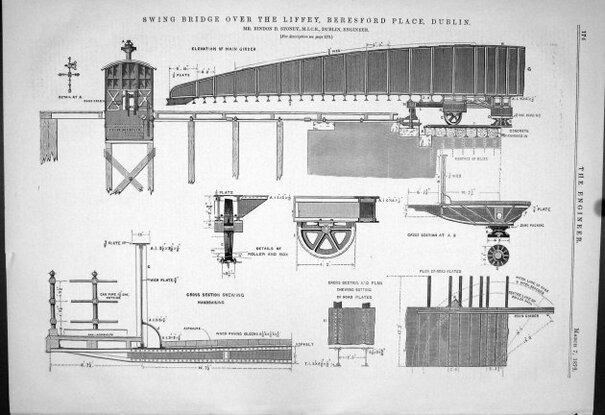 Design for Swing Bridge, Dublin which was published in 1879 for the bridge over the Liffey at Beresford Place. Eventually called Butt Bridge, it linked the new Tara Street with Beresford Place. It was replaced in 1932 with a more conventional structure. (Image: Archiseek.com)