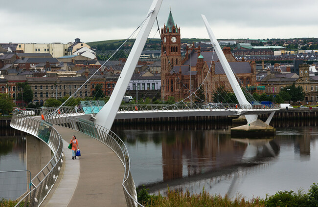 The Peace Bridge over the River Foyle with Guild Hall, Derry. Alamy Stock Photo